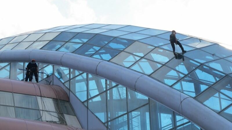 Моем фасад здания с использованием автовышек, предоставляем услуги промышленных альпинистов